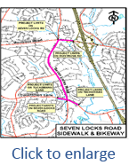 This project provides for pedestrian and bicycle improvements for dual bicycle facilities (on-road and off-road), and enhanced, continuous pedestrian facilities along Seven Locks Road from Montrose Road to Bradley Boulevard (3.3 miles) plus a bike path on Montrose Road between Seven Locks Road and the I-270 ramp, plus northbound and eastbound auxiliary through lanes with on-road bike lanes at the intersection of Seven Locks Road and Tuckerman Lane. The project is broken down into three phases: Phase I provides dual bikeway and pedestrian facilities for the segment of Seven Locks Road from Montrose Road to Tuckerman Lane including the bike path on Montrose and the improvements to the Tuckerman Lane intersection. Phase II provides a dual bikeway and pedestrian facilities for the segment of Seven Locks Road from Tuckerman Lane to Democracy Boulevard. Phase III provides a dual bikeway and pedestrian facilities for the segment of Seven Locks Road from Democracy Boulevard to Bradley Boulevard.