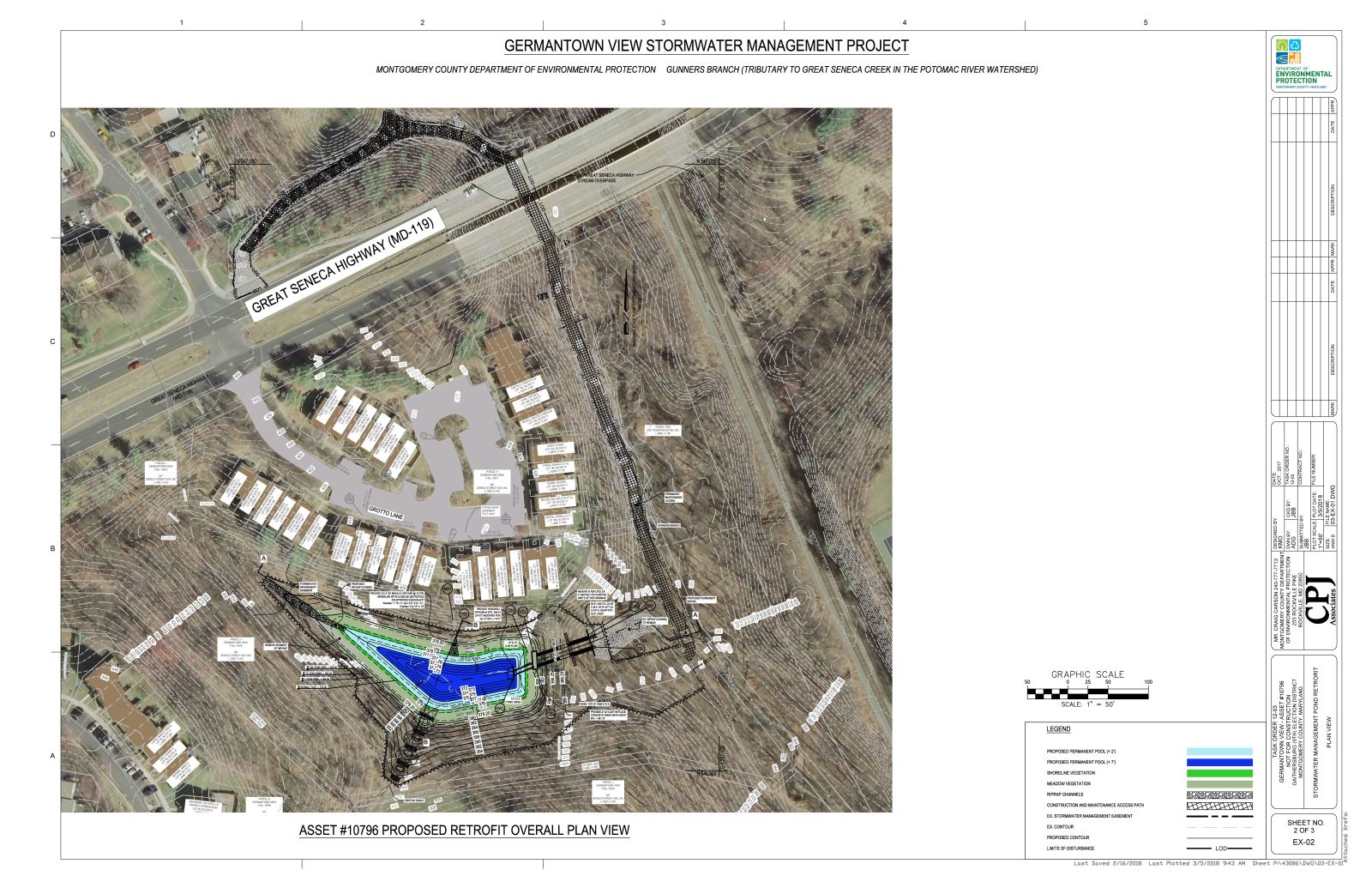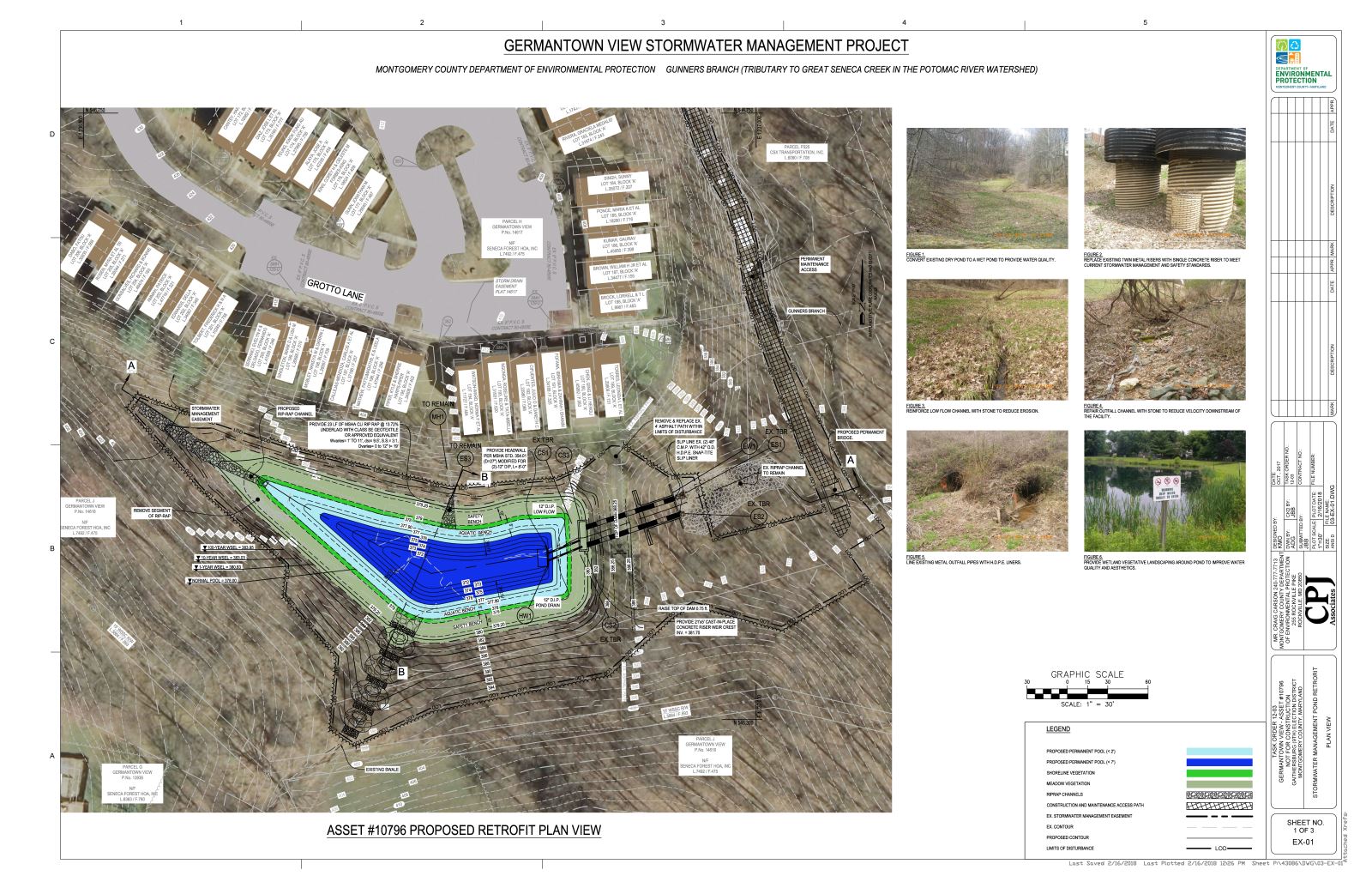 As a part of Montgomery County's ongoing efforts to protect our waters, the stormwater pond within the Seneca Forest community (formerly know as Germantown View) was selected for upgrade and improvements to bring the pond into compliance with current safety and performance standards to reduce the impacts of stormwater runoff on our streams and the Chesapeake Bay. The Germantown View stormwater pond is located in Germantown between Climbing Ivy Drive and Grotto Lane. Originally constructed in 1982 the pond receives stormwater runoff from 25.5 acres, of which 8.6 acres, or 33%, is impervious surfaces (roads, parking lots, rooftops,etc.).