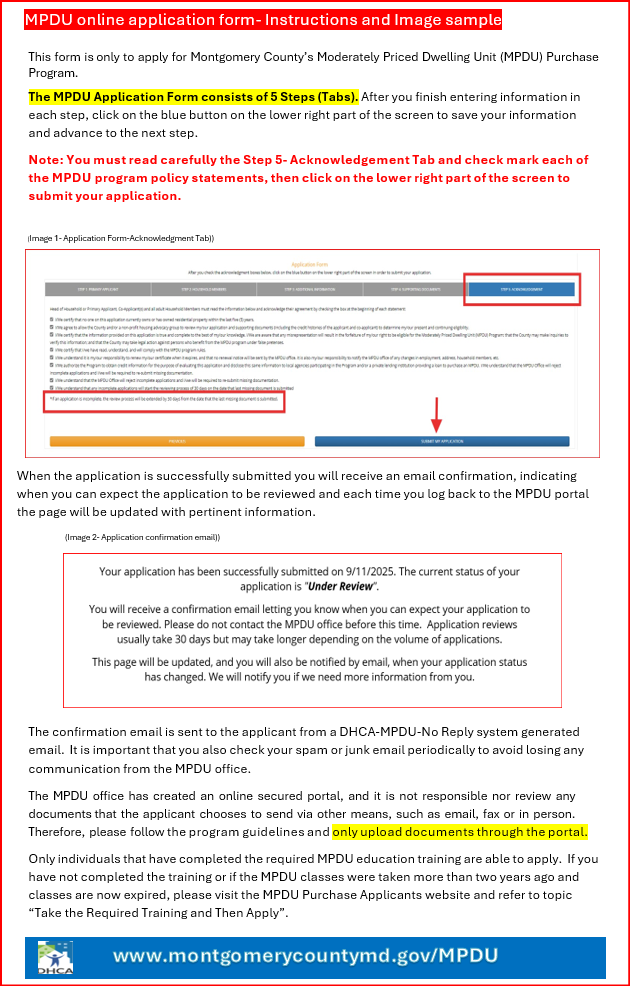 When you take the Application Tutorial, you must be ready to apply. Do not start the application process if you don’t have all the required documents. An incomplete application will be denied. To ensure a successful outcome, below is the MPDU Application “must have” list of documents, which includes samples of documents. You must click on each of the samples and have them ready when it is time to complete the MPDU online application.