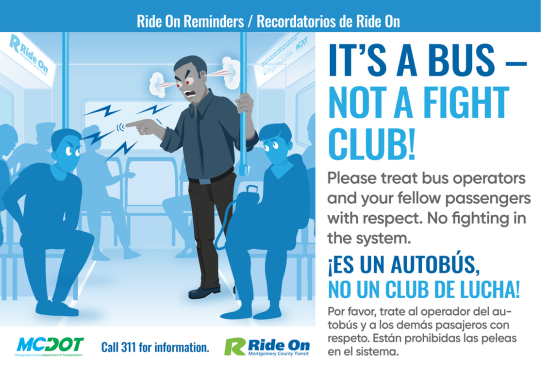 Image text: Ride On Reminders / Recordatorios de Ride On. IT'S A BUS - NOT A FIGHT CLUB! Please treat bus operators and your fellow passengers with respect. No fighting in the system. ¡ES UN AUTOBÚS, NO UN CLUB DE LUCHA! Por favor, trate al operador del au-tobús y a los demas pasajeros con respeto. Están prohibidas las peleas en el sistema. MCDOT logo. Call 311 for information. Ride On logo.