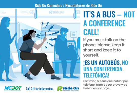 Image text: Ride On Reminders / Recordatorios de Ride On. IT'S A BUS - NOT A CONFERENCE CALL! If you must talk on the phone, please keep it short and keep it to yourself. ¡ES UN AUTOBÚS, NO UNA CONFERENCIA TELEFONICA! Por favor, si tiene que hablar por telefono, trate de ser breve y de hablar en voz baja. MCDOT logo. Call 311 for information. Ride On logo.