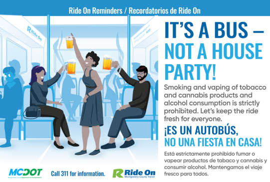 Image text: Ride On Reminders / Recordatorios de Ride On. IT'S A BUS - NOT A HOUSE PARTY! Smoking and vaping of tobacco and cannabis products and alcohol consumption is strictly prohibited. Let's keep the ride fresh for everyone. ¡ES UN AUTOBUS, NO UNA FIESTA EN CASA! Está estrictamente prohibido fumar o vapear productos de tabaco y cannabis y consumir alcohol. Mantengamos el viaje fresco para todos. MCDOT logo. Call 311 for information. Ride On logo.