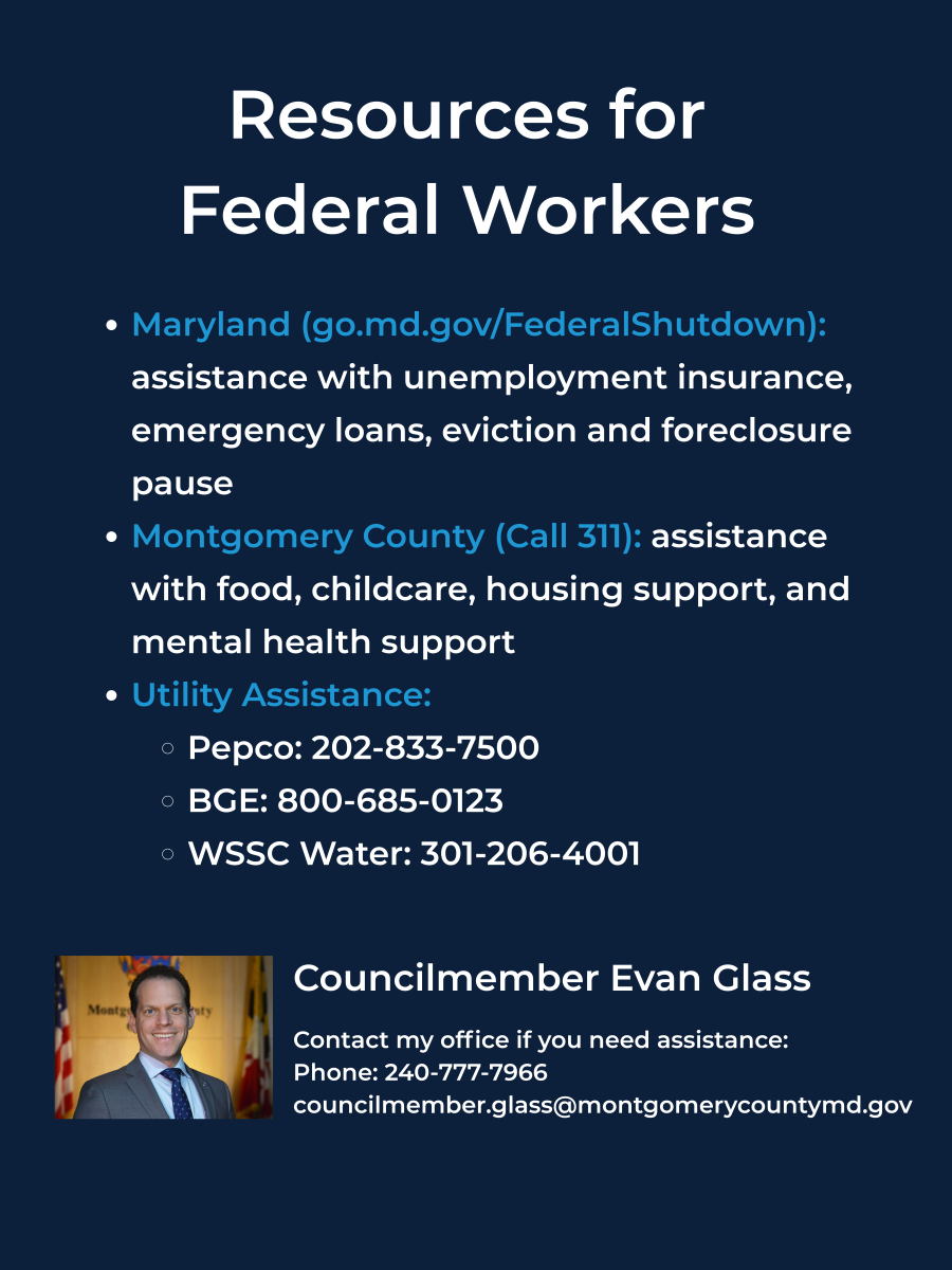 El condado de Montgomery alberga a más de 60,000 empleados federales y decenas de miles de contratistas. Apoyo firmemente a nuestros trabajadores federales.