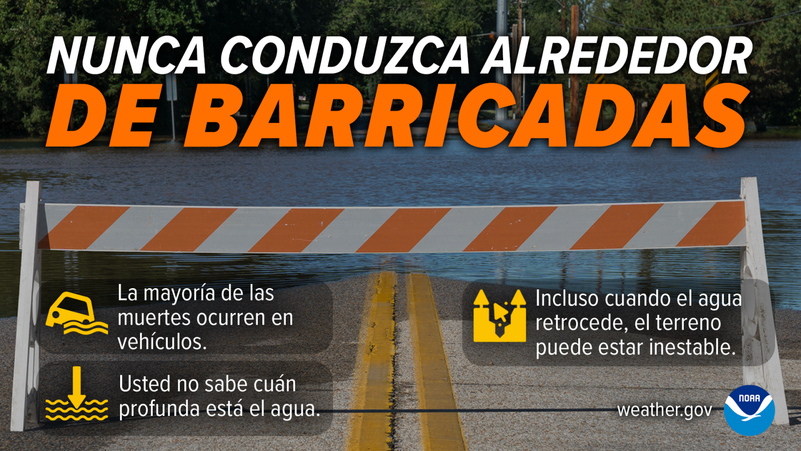 - Road beds may be washed out under flood waters. NEVER drive through flooded roadways. Turn Around Don't Drown®!