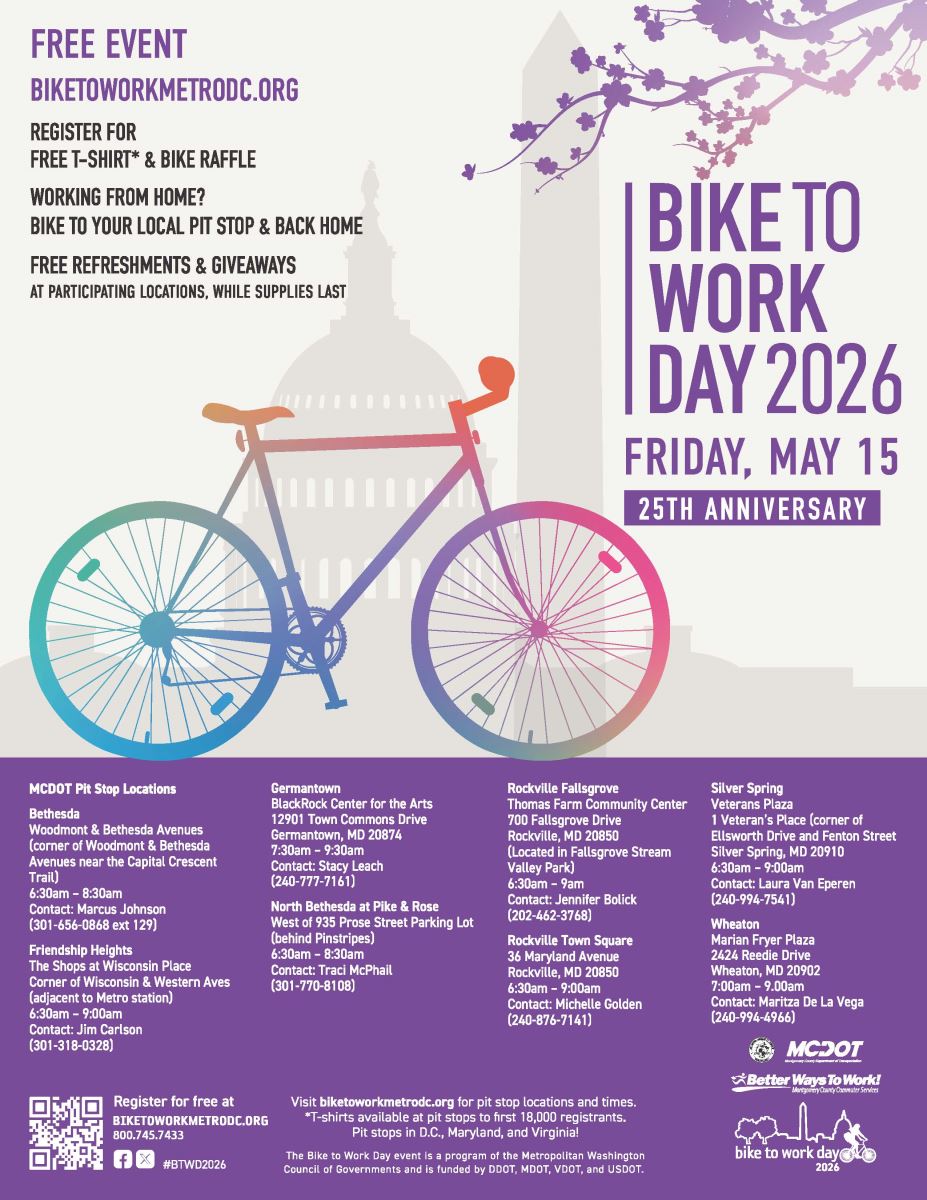 Contact Montgomery County Commuter Services by email or by telephone at 240-777-8380. Businesses and other organizations are also encouraged to contact Commuter Services at that number if they have interested employees or clients.