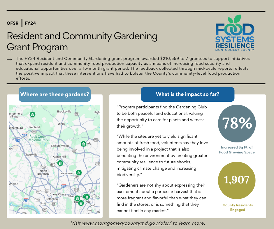 The FY24 Resident and Community Gardening Grant Program has supported seven grantees to expand food production and education across Montgomery County. We’ve seen a 78% increase in food-growing space and engaged 1,907 residents to date.