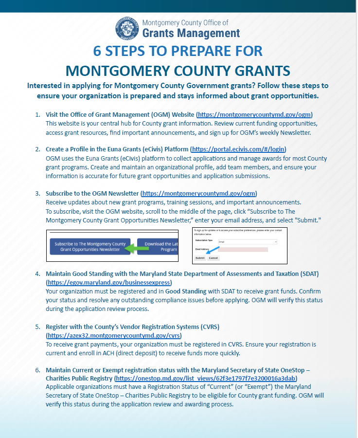 Receive updates on new grant programs, trainings, and OGM news. To sign up, visit OGM's website, scroll to the middle of the page, and, and click the “Subscribe to The Montgomery County Grant Opportunities Newsletter” button. Enter your email and click "Submit."Subscribe to The Montgomery County
