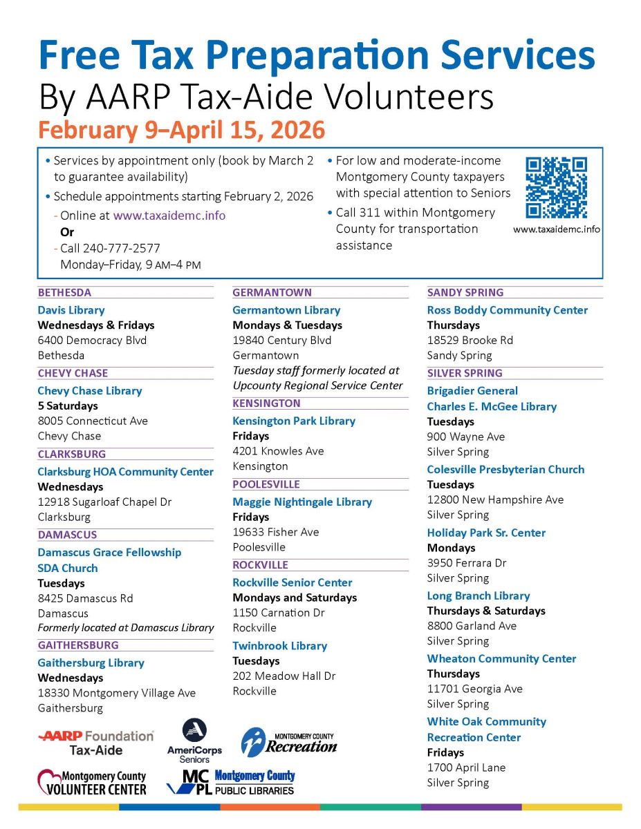 Free tax preparation assistance is offered each year to low-to-moderate-income Montgomery County taxpayers through the AARP Foundation Tax-Aide Program. Services are provided by trained volunteers and are by appointment only. Scheduling for tax appointments will open February 2, 2026.