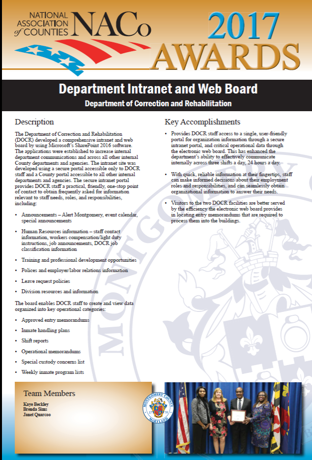 On December 13th, 2017 DOCR staff were honored by County Executive Leggett at the annual NACO Awards Ceremony. DOCR was pleased to have two programs of innovation recognized for this national award. The CISM Team was further recognized as a top 100 award for the entire country.