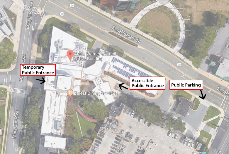 - Cross at traffic light on E. Jefferson St. & proceed to Council Office Bldg.