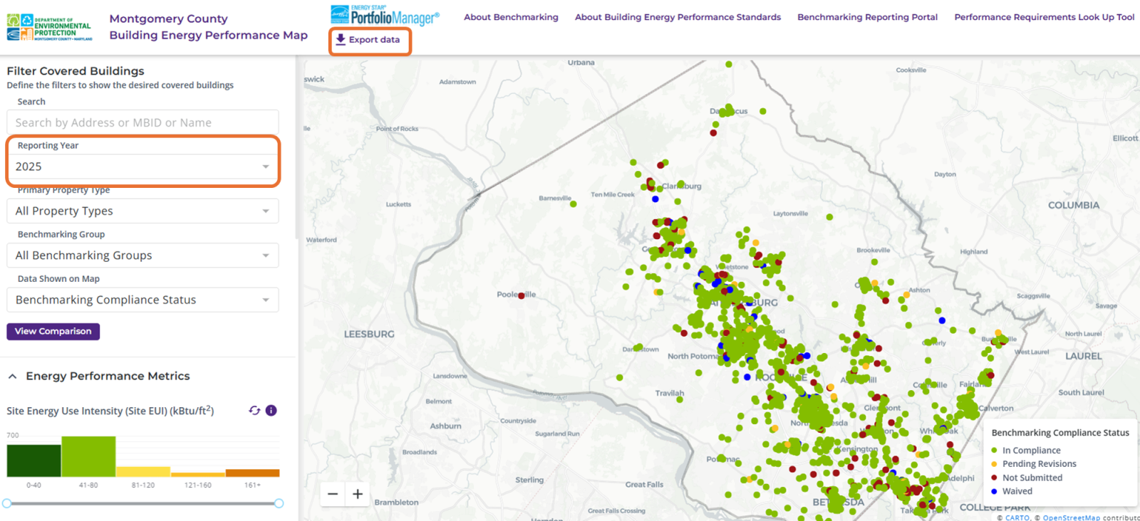 For public access to benchmarking data, the Montgomery County Building Energy Performance Map is an interactive and user-friendly tool to investigate compliance status and energy performance data for each covered building. It also provides comparisons of each building's latest energy performance to proposed Building Energy Performance Standards (BEPS). This report updates as new information is reported to DEP.