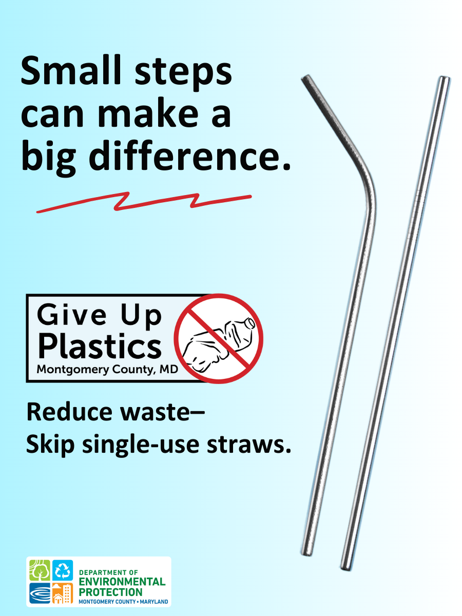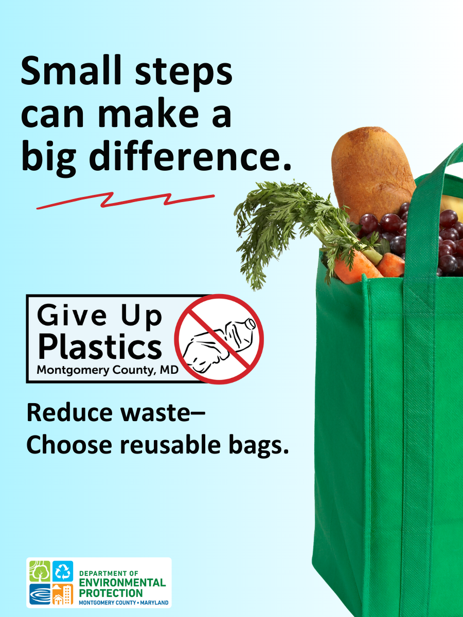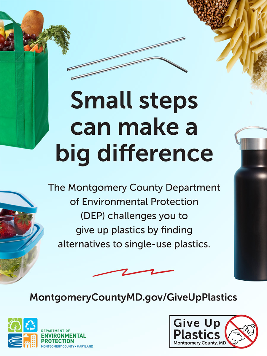 The Montgomery County Department of Environmental Protection (DEP) challenges you to give up plastics by finding alternatives to single-use plastics. Even taking small steps can make a big difference.