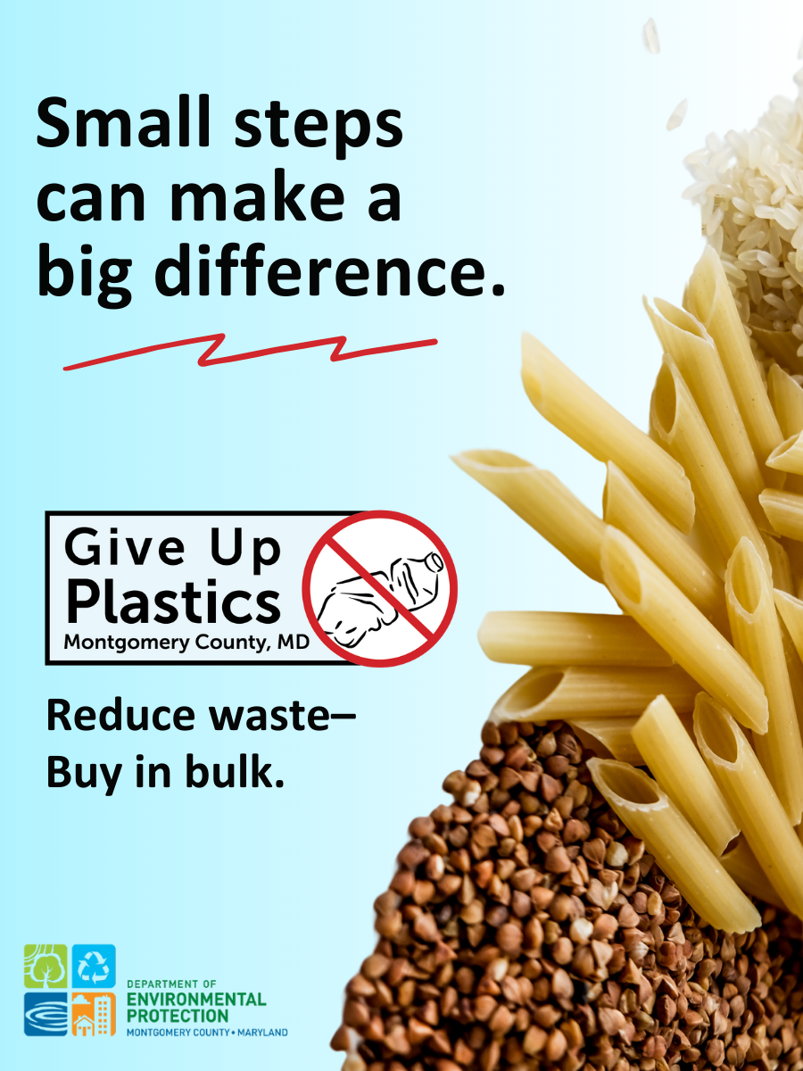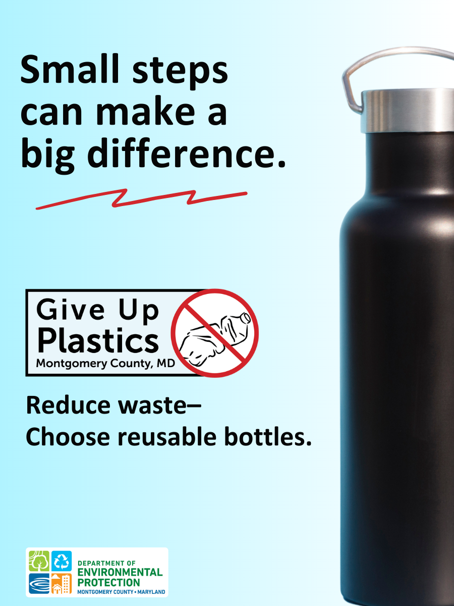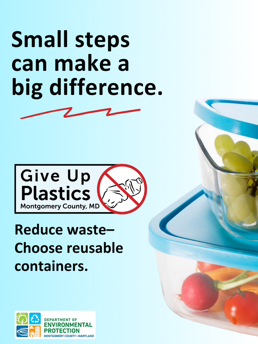 The Montgomery County Department of Environmental Protection (DEP) challenges you to give up plastics by finding alternatives to single-use plastics. Even taking small steps can make a big difference.