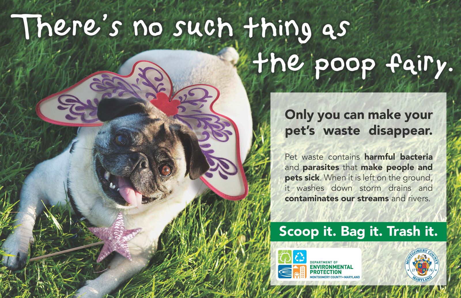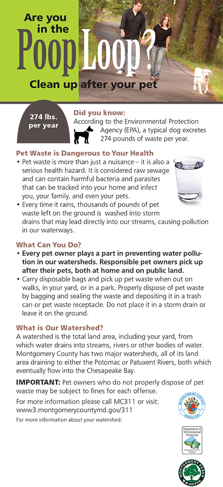 Every pet owner plays a part in preventing water pollution in our rivers and streams. Responsible pet owners pick up after their pets, both at home and on public land.