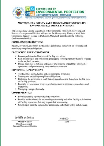 It is the Environmental Policy of Montgomery County to operate its Yard Trim Composting Facility, located in Dickerson Maryland, in a manner that promotes health, safety and the environment as a core and integral part of its business. We will do this by adhering to the following principles: