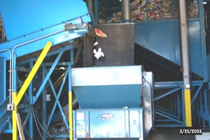 Into the Air Classifier, which pushes the aluminum and plastic upwards by air currents, and then into the Cyclone, where they are separated from the air stream and go to Light Item Sorting. Heavier items (unbroken and large glass pieces) fall to the bottom.