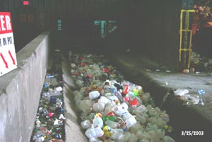 Recycling collection trucks unload glass, plastic, steel and aluminum containers onto the tipping floor.