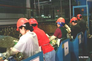 Workers sort plastic by type and drop each into tubes where currents from air blowers propel the material into storage silos.