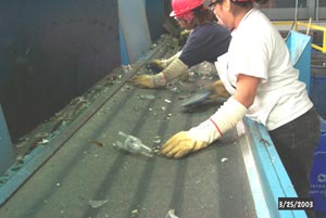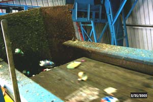 Conveyors take the unbroken and large glass pieces to a sorting station where green, brown, and clear glass is dropped into separate bunkers for storage until being sent to a processor.
