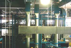 Cans continue on conveyors that lead to a tube where air current moves the cans to a storage silo.
