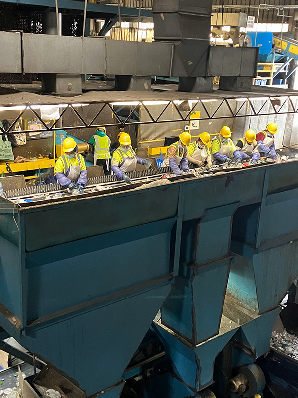 At the pre-sort station, workers remove non-recyclable items as trash. They take out aluminum foil, paper, and large plastic containers for recycling. Sorters also divert PET thermoform packaging (e.g., plastic clamshells), plastic flower pots, and plastic pails and buckets for sorting at other stations.