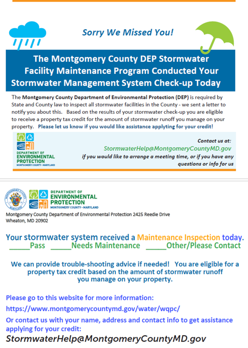 ESD facilities on Single Family Residential Properties are now required to be inspected on a triennial basis similar to ESDs on commercial properties. These facilities are usually installed by the developer at the time of construction or installed by the property owner through a program such as RainScapes. DEP inspects these facilities on a three-year rotation based on location within the county. A notice will be mailed out indicating that an inspector will be in the area in the next coming weeks. You do not need to be home for the inspection, however, if you have a fenced yard or a dog you may wish to schedule an inspection through [email protected]. The inspector will conduct the inspection and leave a postcard (PNG) on your door indicating whether the facility has passed or requires maintenance. You may also be instructed to contact the inspector for further instructions. The maintenance is voluntary at this time and your obligations are complete once the inspection is completed, however completing recommended maintenance items may help prevent future stormwater drainage problems. The DEP inspector is also available to assist with the Water Quality Protection Charge (WQPC) Tax Credit Application. Learn more about the WQPC Program