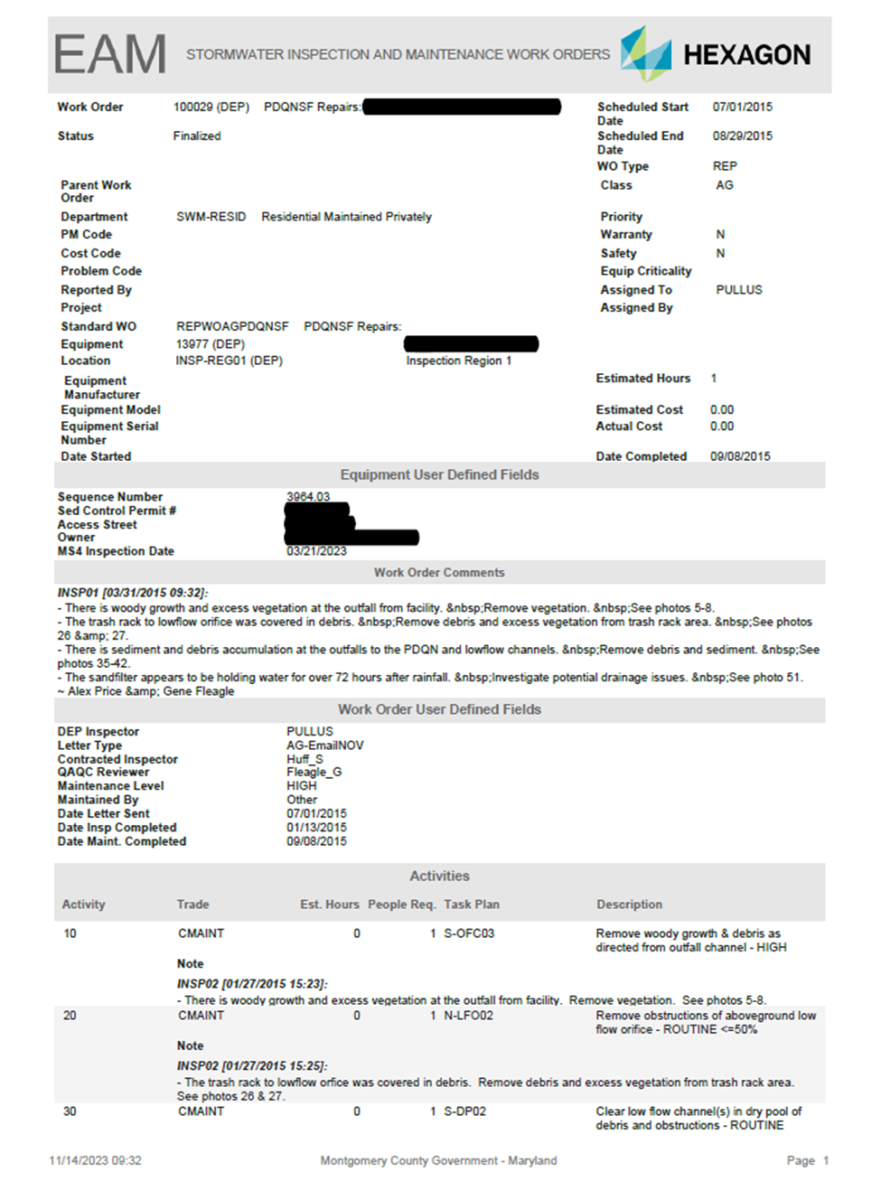 Stormwater facilities on communally owned residential areas are typically managed by the property manager employed by the HOA or COA. After the inspection is complete the property manager or designated representative will receive a work order work order (PNG) indicating what work needs to be completed. The property owner is responsible for both structural and non-structural maintenance of the facility unless they have transferred responsibility for structural maintenance only over to the county via the county’s Structural Maintenance Transfer Program. The responsibilities of each facility are outlined in the Stormwater Easement and Covenant documents. The property manager is responsible for hiring a contractor from our approved contractor lists. Once the work is complete the property owner is to contact the DEP inspector designated in their work order to schedule a final inspection by DEP staff.
