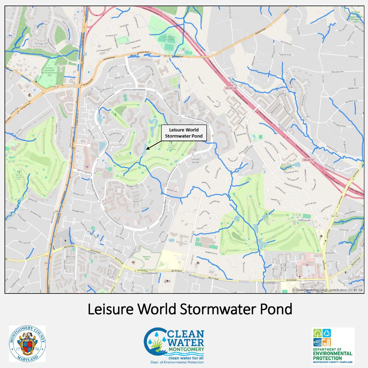 The Leisure World Stormwater Pond, originally constructed in 1982, was selected for upgrades and improvements after a 2020 inspection of the pond conducted by DEP revealed several structural issues with the dam embankment. Temporary repairs were completed later in 2020. Permenant repairs and improvements will bring the pond into compliance with current safety and performance standards reducing the impacts of stormwater runoff on our local streams and the Chesapeake Bay.
