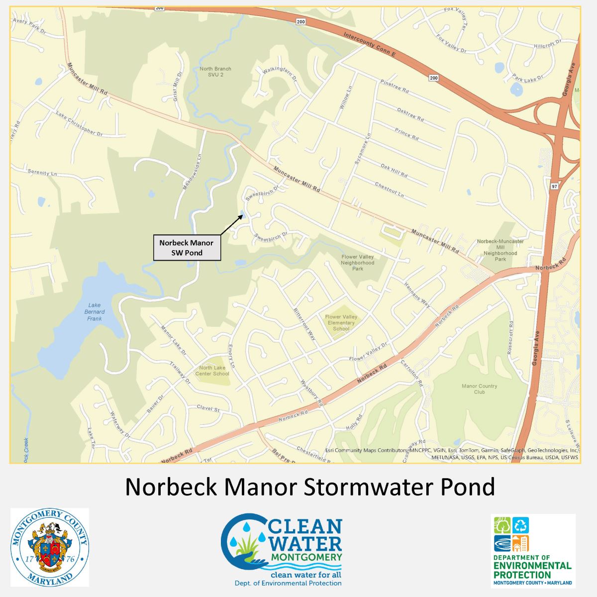 The Norbeck Manor Stormwater Pond was selected for upgrades and improvements after a 2018 inspection of the pond conducted by DEP revealed several structural issues. Repair work on the pond, which was originally constructed in 1988, will also bring the pond into compliance with current safety and performance standards to reduce the impacts of stormwater runoff on our local streams and the Chesapeake Bay.