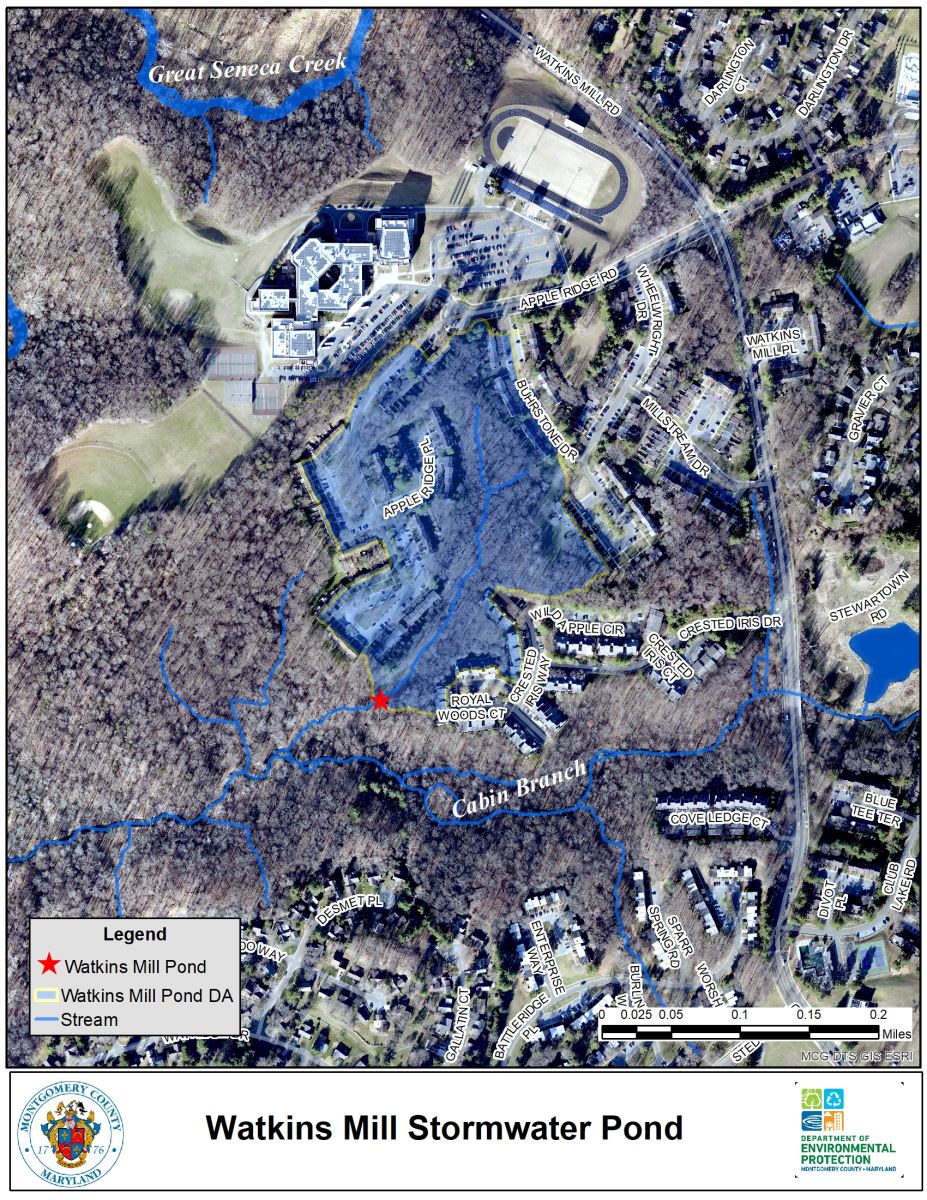 Watkins Mill Pond #1 is located on Homeowner Association property in a stream valley in the Seneca Creek Watershed. The pond is part of the Apple Ridge community and provides treatment for 20 acres of the community including the townhomes and associated impervious area such as roads, parking areas and sidewalks. This pond was accepted into the County’s stormwater facility maintenance program for structural maintenance in 2005. The County DEP provides structural maintenance and the HOA is responsible for non-structural maintenance such as routine trash removal.