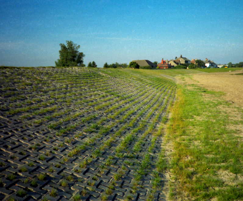The ACB mattresses will be keyed into existing soil at the top of the embankment and the bottom as shown in the cross sectional detail above. The ACB system will have approximately 20 percent open void space that will be filled with topsoil and seeded with a meadow seed mix to provide a vegetative cover.