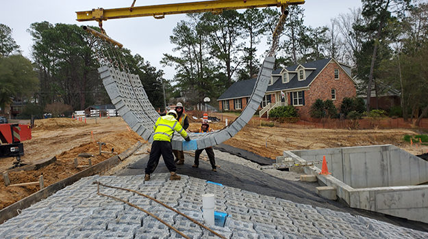 Each of the Articulated Concrete Blocks is 16"L X 16"W X 5"H and are bound together with polyester cables designed to meet stress requirements. Large rectangular ACB mattresses will be placed on a prepared base consisting of geotextile fabric and a 6 inch bed of gravel to provide safe drainage through the ACB's and down the embankment slope.