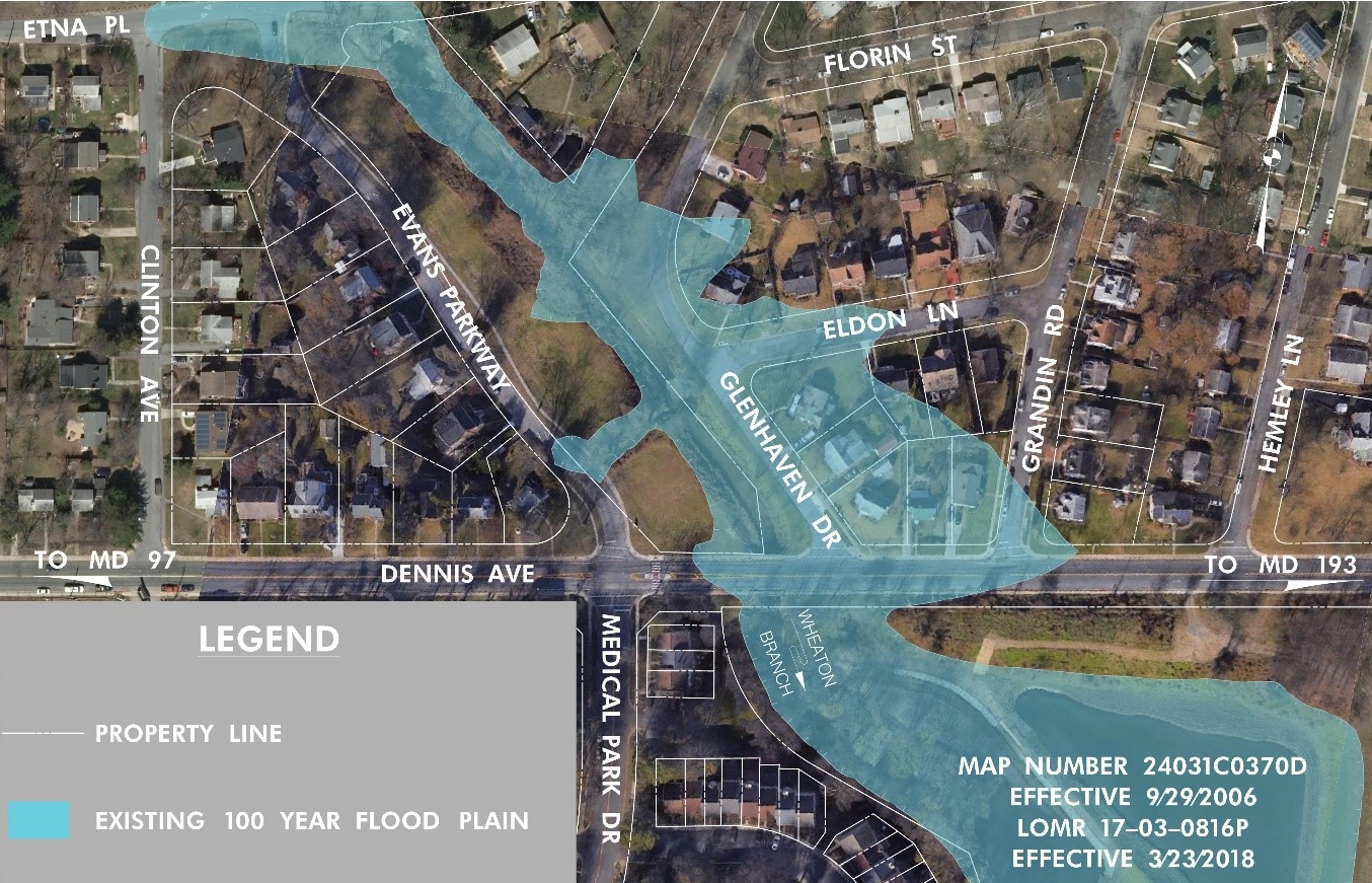 Issues with flooding were noted in 2006 and 2010 by residents living upstream of Dennis Avenue. A floodplain study commissioned by the Montgomery County Department of Environmental Protection (DEP) revealed that the previously approved Federal Emergency Management Administration (FEMA) map did not reflect the actual floodplain conditions. As a result, FEMA issued a Letter of Map Revision (LOMR) in 2018 that now includes five (5) adjacent residences near the intersection of Glenhaven Road and Dennis Avenue, and several roadways, in the 100-year floodplain. There are an additional eight (8) residential properties impacted by the 100-year floodplain. It was determined that the extensive flooding was caused by water backing up from undersized Dennis Avenue bridge and Wheaton Branch Stormwater Management Pond. To mitigate the flooding the bridge must be replaced in conjunction with floodplain and pond modifications. Montgomery County’s Department of Transportation (DOT) is responsible for the bridge replacement project.