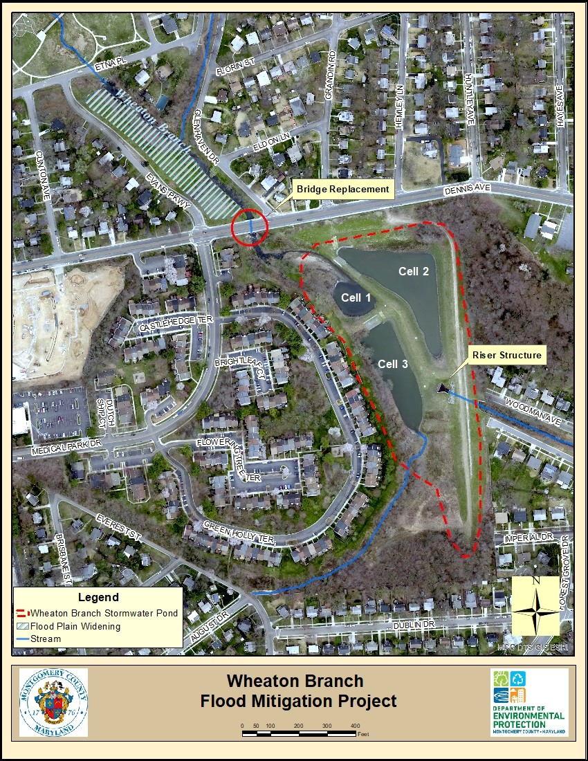 DEP’s engineering contractor has prepared site design plans which detail the design and construction of the Wheaton Branch Stream channel upstream of the Dennis Avenue bridge. The site design plan, currently in the final design stage will reduce flooding by providing more water storage capacity. Additional water storage capacity will be accomplished by; 1) widening both the stream channel and the adjacent flood plain and 2) dredging accumulated sediment from the first cell of the Wheaton Branch stormwater management pond. Work on the Flood Mitigation Project will begin after the Dennis Avenue bridge replacement is complete.