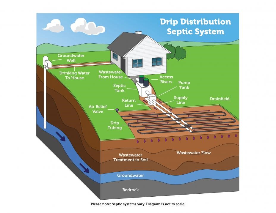 One alternative or innovative type of septic system in use in the County is a shallow drip dosing system. These systems are installed just under the surface of the yard and pump effluent into a network of small pipes. The pipes have small holes that discharge the effluent into the soil. This type of alternative system is used only to relieve a failed septic system and cannot be used for construction of new buildings or expansion of existing buildings.