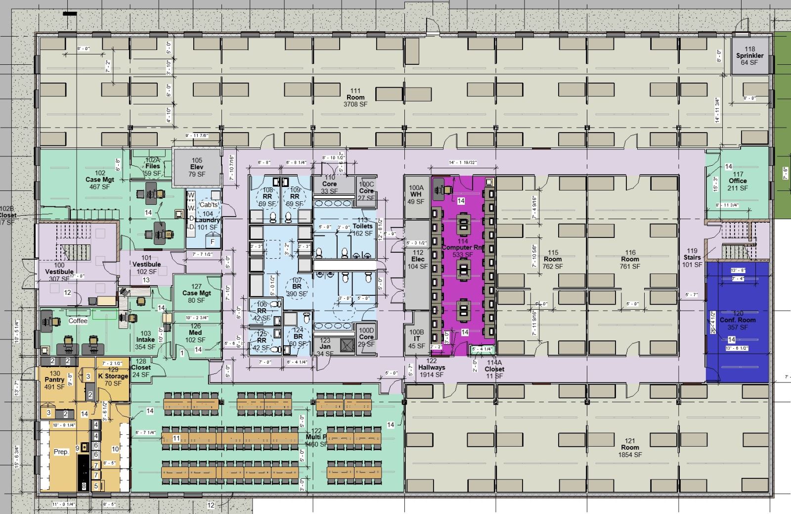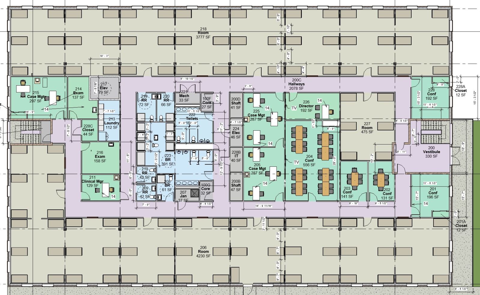 The two-story 30,000 square foot building will be renovated and changed from Commercial Office Use to a Homeless Shelter with 200 beds Sleeping areas, Bathing, Eating, Computer, and Administrative Space.