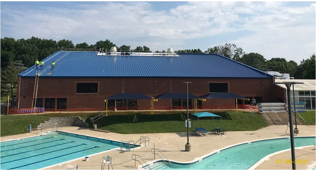 With the facility closed due to Covid-19, interior painting (upper floor and pool areas), installation of new ceiling grid and tiles, replacement/refinishing of doors, new vestibule sliding doors, a new reception desk, addition of a small meeting room, and phase 2 of replacement of the roof (sloped roof over main indoor pool) have been completed.
