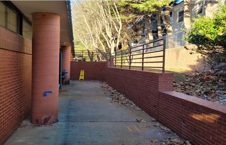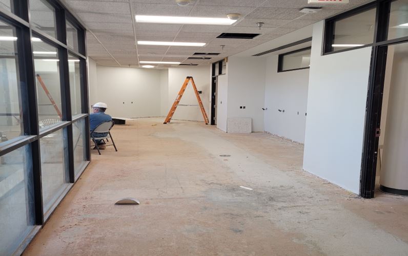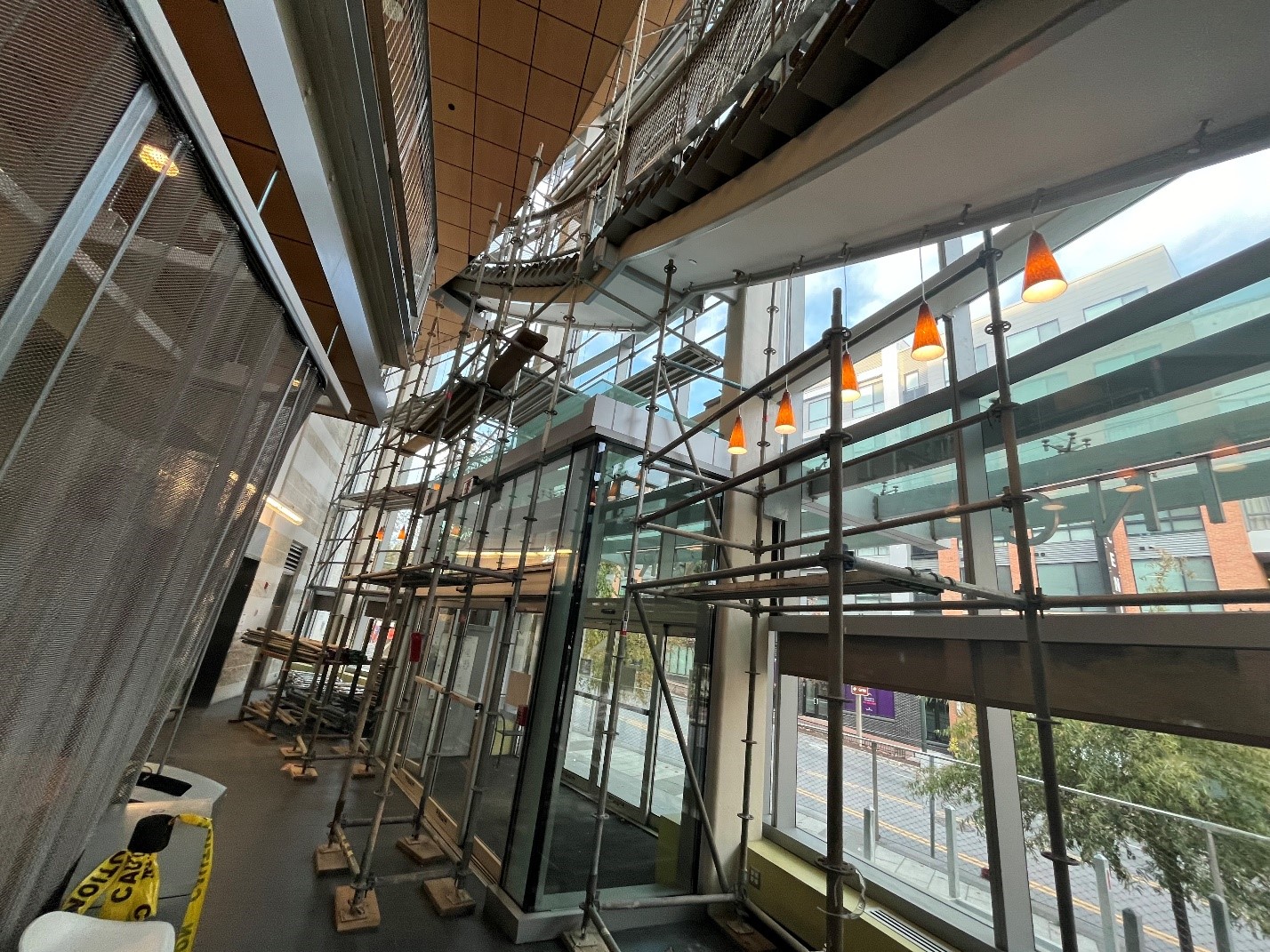 The Program of Requirements called for replacing the exterior sliding doors with swing out doors, replacing the vinyl flooring and carpeting, exchanging the children's play area and stacks to reduce the noise in the 4th floor meeting rooms along with adding a ceiling in the meeting rooms, replacing defective windowblinds, adjusting the slope of the glass canopy over the cafe entrance to better drain, replacing damaged and dirty furniture, installing 3 new service desks (oneon each floor), new water fountains with bottle filling stations, repairing walls, adding corner guards and repainting.