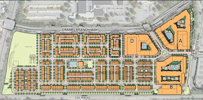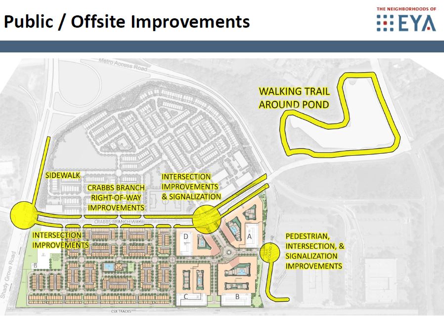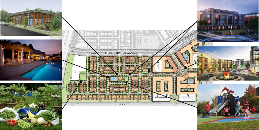 OPD selected EYA as the County’s development partner to be the master planner for all of the County Service Park, to redevelop the western side of Crabbs Branch Way, known as Shady Grove Westside, and to design and build County infrastructure. EYA will redevelop Shady Grove Westside with 1,521 residential dwelling units, including 211 Moderately Priced Dwelling Units (MPDUs) and 116 Workforce Housing (WF) units; 41,828 square feet of retail; and a public library.