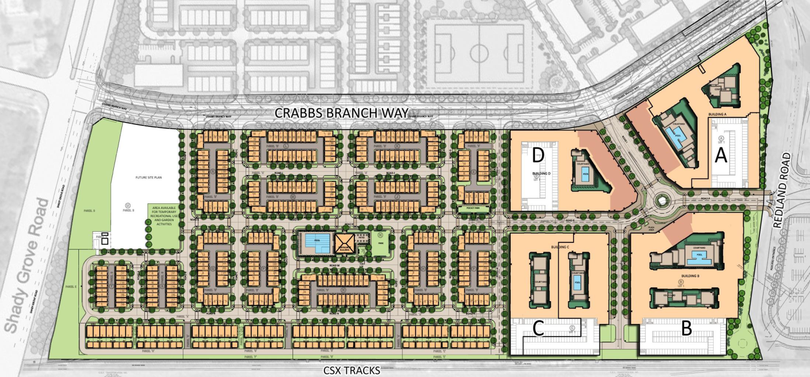 The townhomes, two-over-two condominiums and the first two mixed-use buildings with multifamily rental units and ground floor retail space are completed. The County anticipates selling the land for the final multifamily rental building to EYA by the end of 2025. More information may be found at: https://www.eya.com/development/shady-grove.