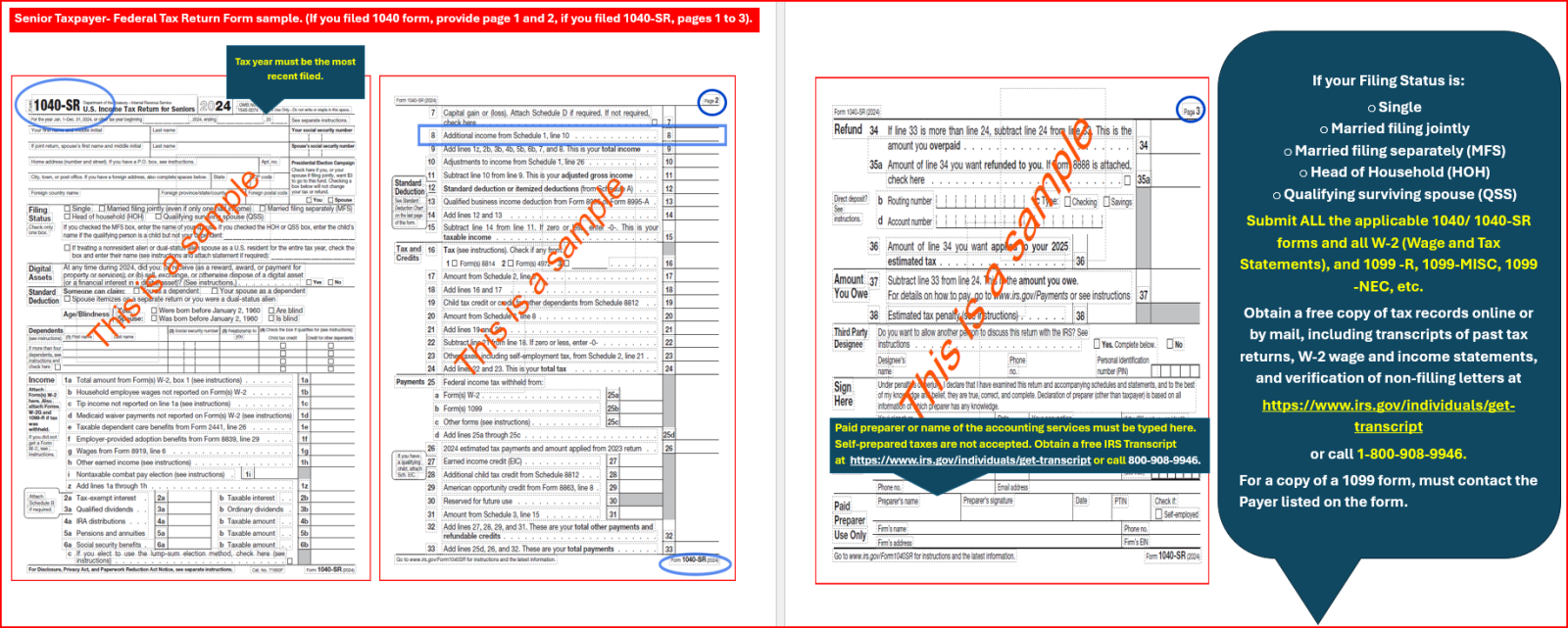 - Federal Income Tax return: The most recently filed (Form 1040 and W-2/1099) for every wage earner. For additional income reported on the tax return, such as business income, also provide a Schedule 1 or Schedule C form. If you did not file taxes, obtain an IRS Verification of Non-Filing Taxes (Form 4506-T). The preferred format for submitting a 1040 form is PDF. A picture/screenshot is also acceptable. If so, only upload pages 1 and 2 with the tax preparer's signature/stamp. Self-prepared taxes are not acceptable. Obtain a Tax Return Transcript and all other tax-related transcripts at no cost from the Internal Revenue Service (IRS) at https://www.irs.gov/individuals/get-transcript or call 800-908-9946.