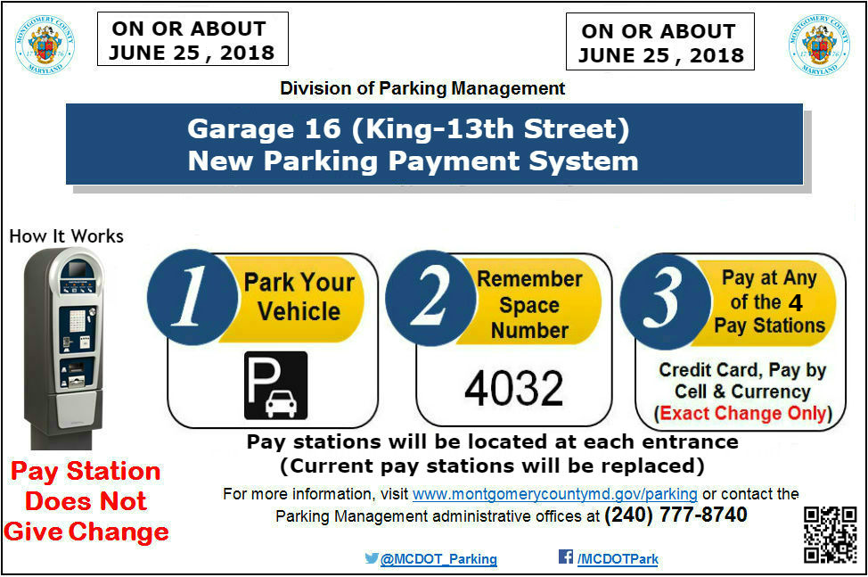 On or about Tuesday, April 10, 2018, Montgomery County Department of Transportation (MCDOT) Division of Parking Management will modernize the Parking Payment System in the King-13th Street Garage in Silver Spring.