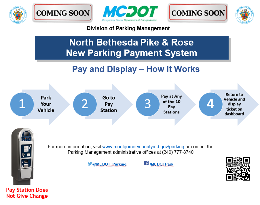 On or around Monday, July 2 2018, Montgomery County Department of Transportation (MCDOT) Division of Parking Management will modernize the on-street Parking Payment System in Pike & Rose in North Bethesda. The New Parking System uses Pay and Display and operates like a single space meter where the customer would have to estimate the time and pre pay prior to leaving to their destination. User must return to vehicle and display ticket on dashboard.