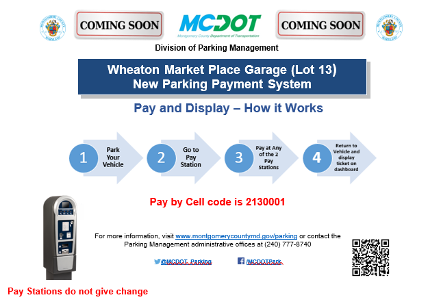 Coming soon, Montgomery County Department of Transportation (MCDOT) Division of Parking Management will modernize the Parking Payment System at Lot 13. The Parking System uses Pay and Display and operates like a single space meter where the customer would have to estimate the time and pre pay prior to leaving to their destination. User must return to vehicle and display ticket on dashboard.