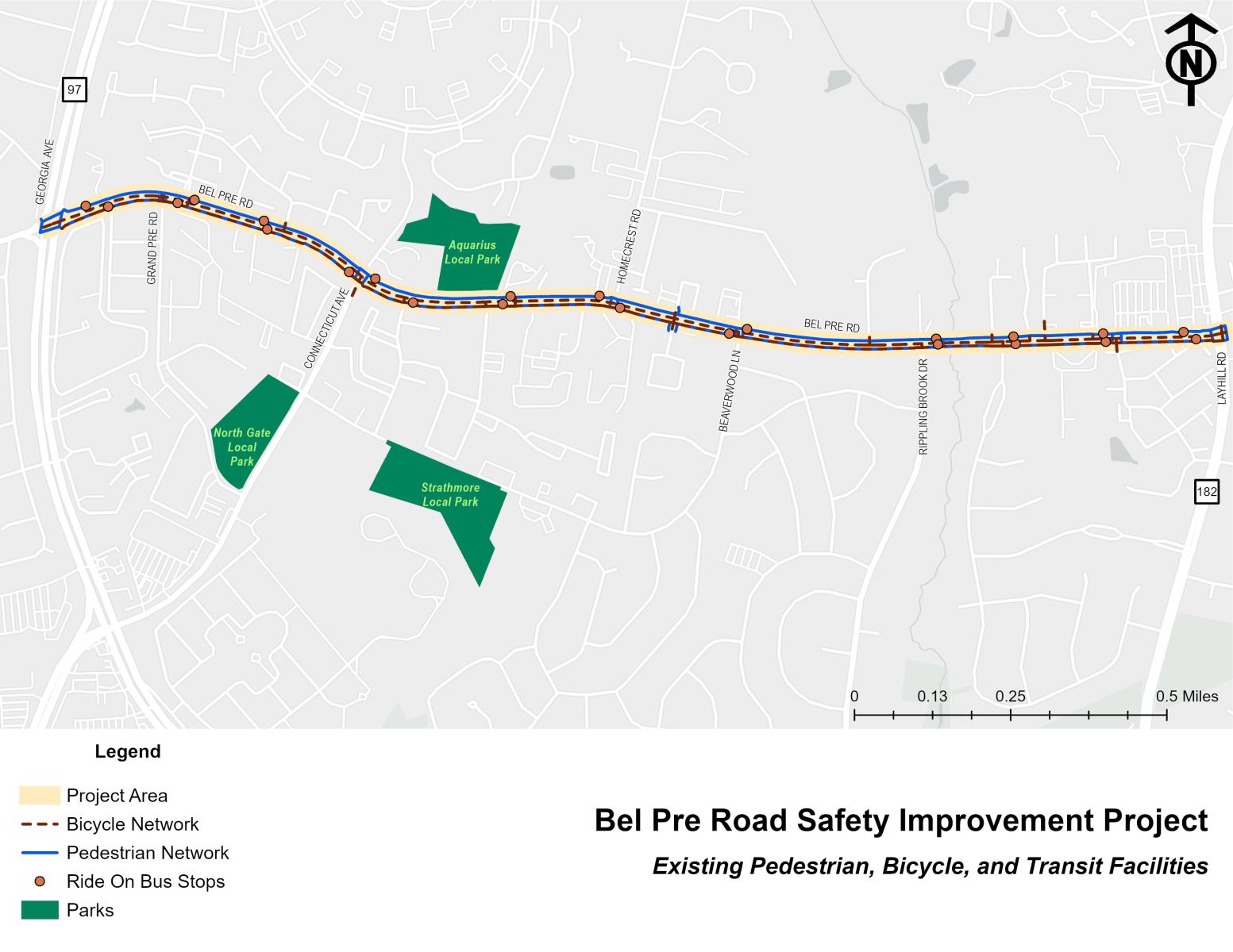 This project will provide safety improvements to help mitigate crashes involving pedestrians and bicyclists along a 1.9-mile stretch of Bel Pre Road between Georgia Avenue and Layhill Road. This segment of roadway is as a Vision Zero High Injury Network with higher number of crashes (at least one crash per mile per year).