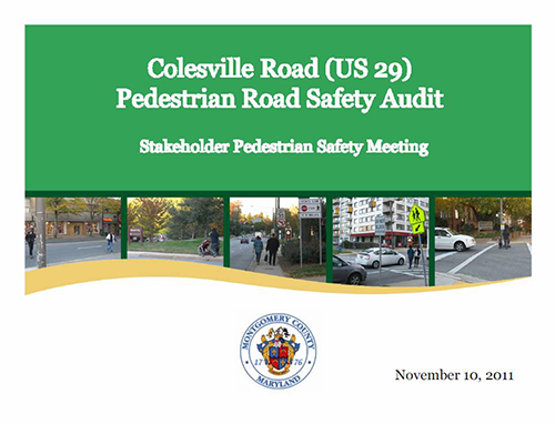 The Colesville Road High Incident Area (HIA), which stretches from Fenton Street to North Noyes Street, was the study area for a PRSA conducted in November 2011. The Montgomery County of Department of Transportation (MCDOT) teamed Maryland State Highway Administration (MSHA) staff to conduct this two-day audit in Silver Spring. This segment of Colesville Road was notable, particularly because of the density of unique “traffic generators”, including dining, and shopping bisected by a major regional corridor.