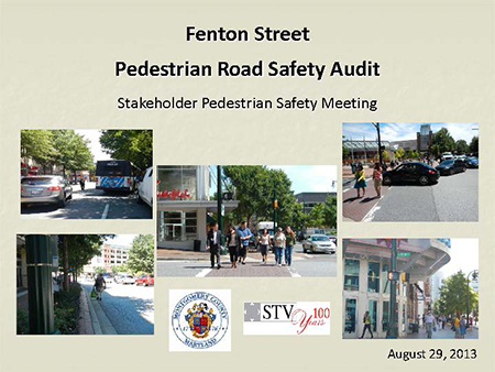 In October 2013, Montgomery County Department of Transportation (MCDOT) performed a pedestrian road safety audit (PRSA) along Fenton Street from Cameron Street to Wayne Avenue in Silver Spring, Maryland. Montgomery County was part of a multi-disciplined team, including the Maryland State Highway Administration (MSHA) and Arlington County (Virginia) Department of Transportation that led the audit over a two- day, daytime and nighttime period in the central business district of Silver Spring Maryland. This segment of roadway is notable due to a high pedestrian activity generated by the commercial and residential land use. It should be noted the heaviest pedestrian activity occurs during weekday lunch times, weekends, special events, and performances at the Fillmore theatre located south of Fenton Street.