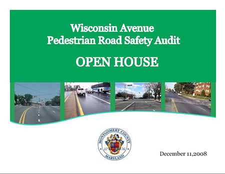 In December of 2008, MCDOT led a multi-disciplined team, including the Maryland State Highway Administration (MSHA), Federal Highway Administration (FHWA), and Montgomery County Police Department (MCPD) in a two-day pedestrian road safety audit (PRSA) along Wisconsin Avenue in the Bethesda Central Business District. The PRSA study area extended from Leland Street to Montgomery Avenue, encompassing seven intersections. The audit team also included participants from the Bethesda-Chevy-Chase Regional Services Center, Bethesda Urban Partnership, and local community members.