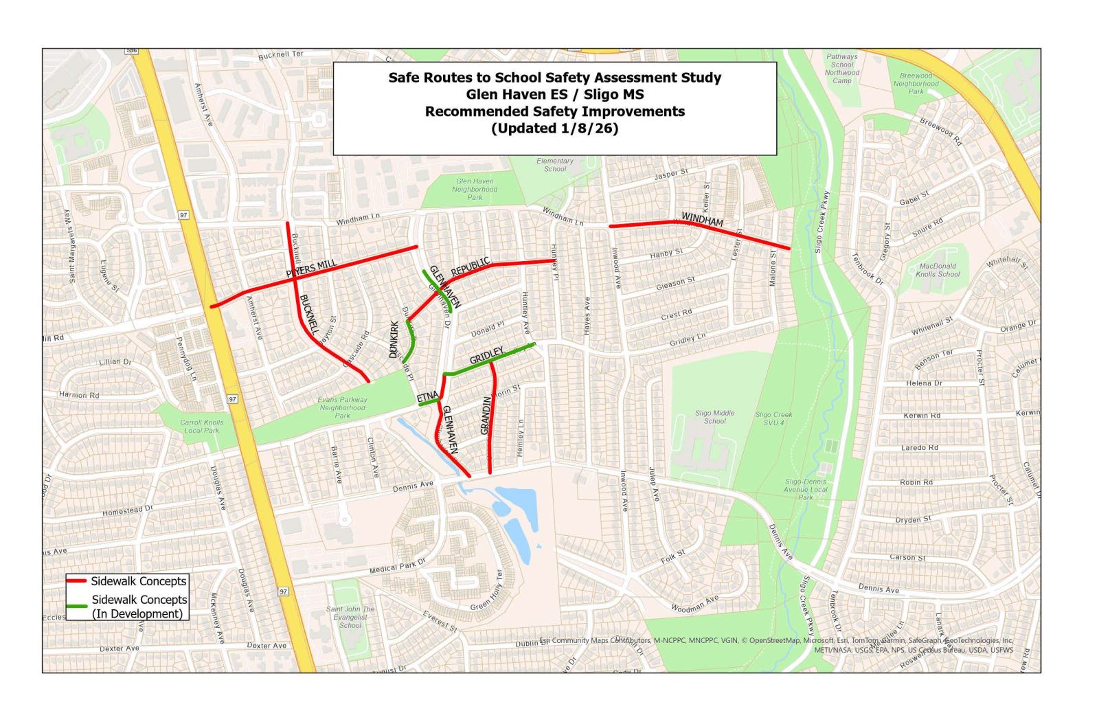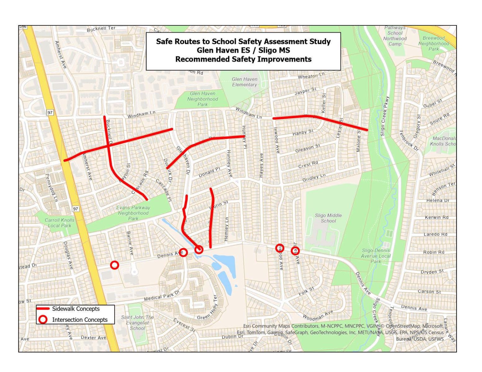 The MCDOT Safe Routes to School team has conducted safety assessments of the Glen Haven Elementary School and Sligo Middle School walksheds. This assessment, which is referred to as a walkability study, reviewed the condition of existing infrastructure and developed improvements that may be implemented within the school walksheds to provide safe and accessible routes for students walking and biking to and from school.