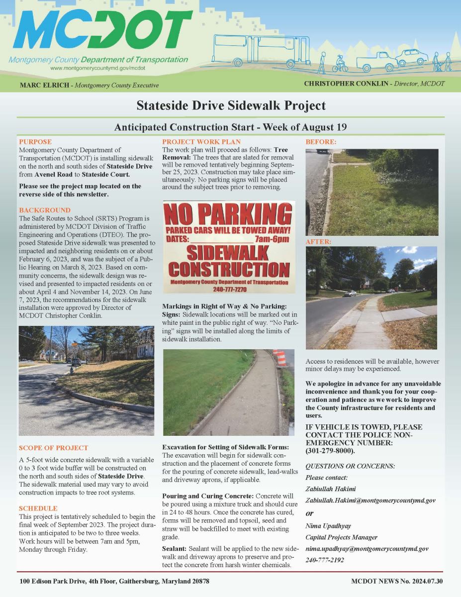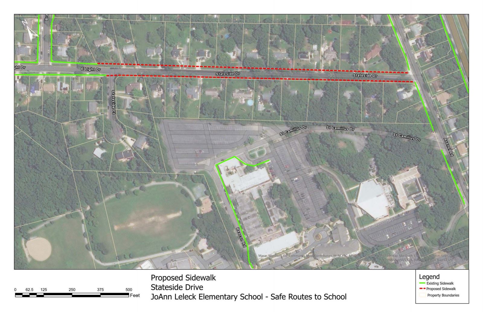 Sidewalks along Stateside Drive is scheduled for construction. Weather permitting, the construction is scheduled to begin by August 19, 2024.